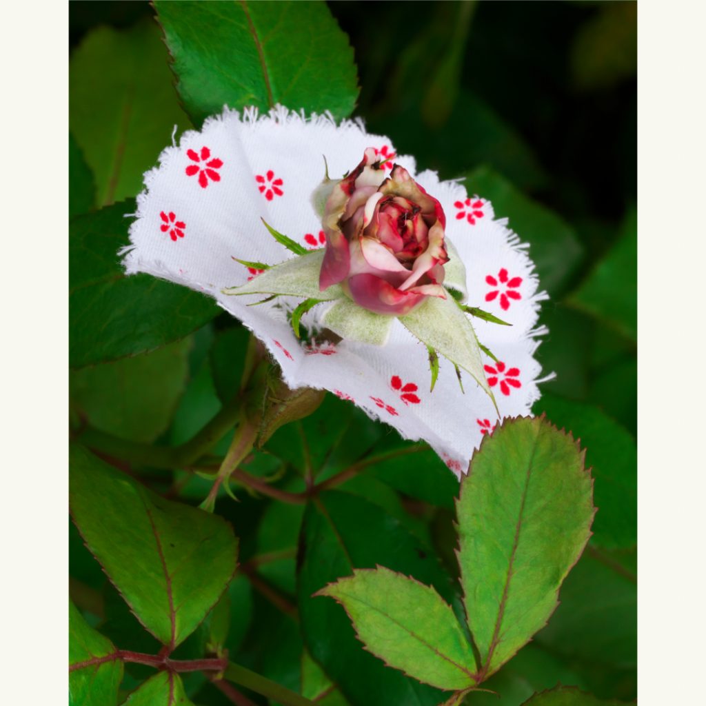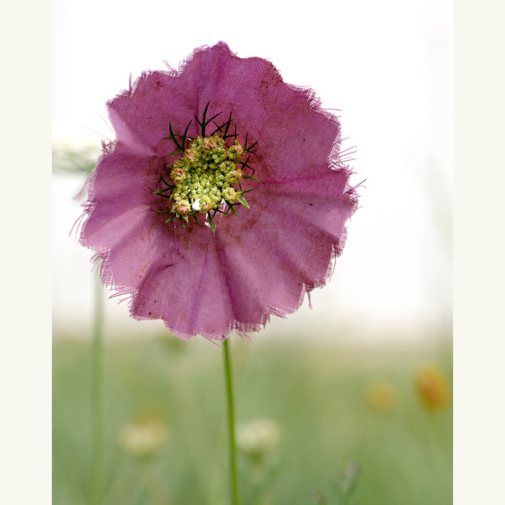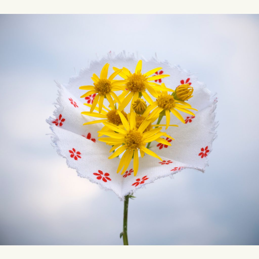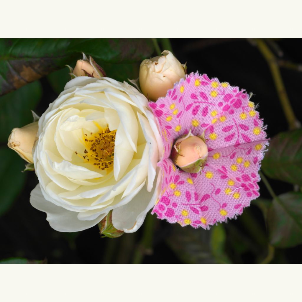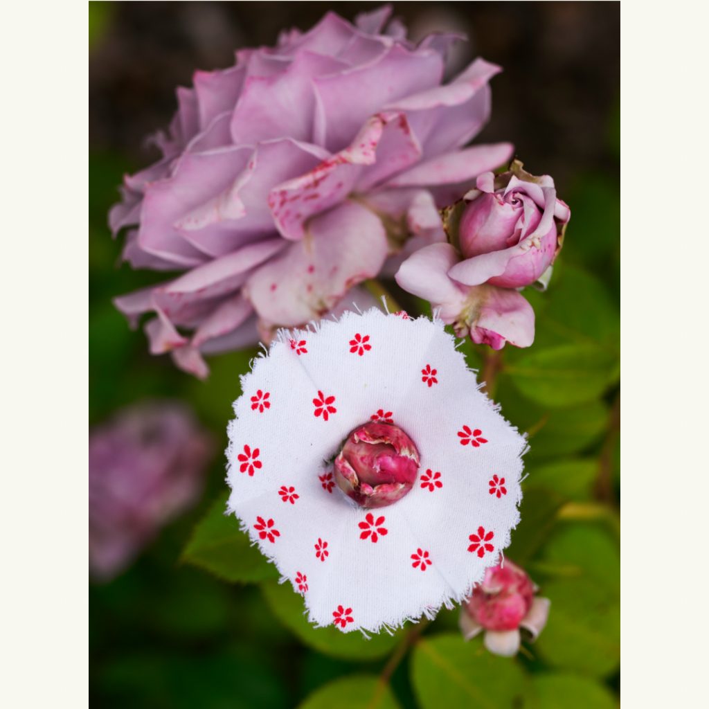 Bei einem Spaziergang machte ich eine wundersame Entdeckung: Ich fand eine weggeworfene Regenschirmrosette, wie sie an der Spitze alter Stockschirme verwendet wird. Sie war wie eine zarte Blüte, sorgfältig in der Mitte gefaltet und mit einer kleinen Öffnung versehen. Ich habe ganz spontan zwei Dinge in meinem Kopf miteinander verbunden. Die kleinen, oft übersehenen Schönheiten am Wegesrand und diese zauberhafte Manschette, die sie so wunderbar zur Geltung bringt – entzückend!