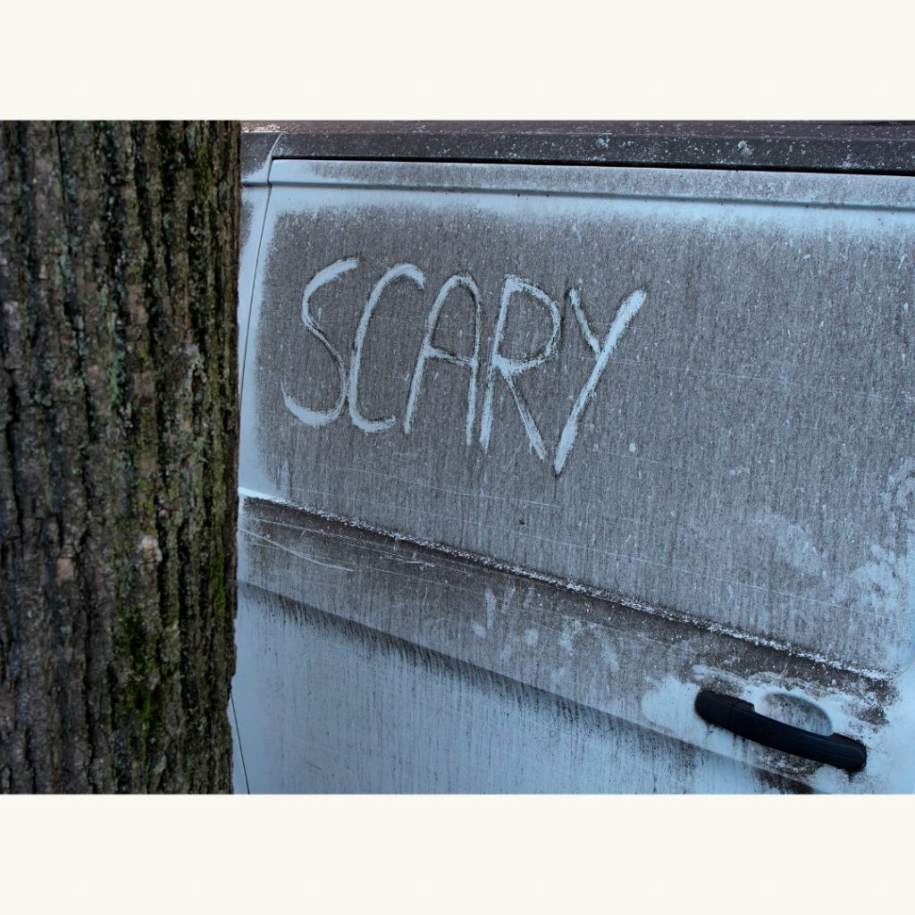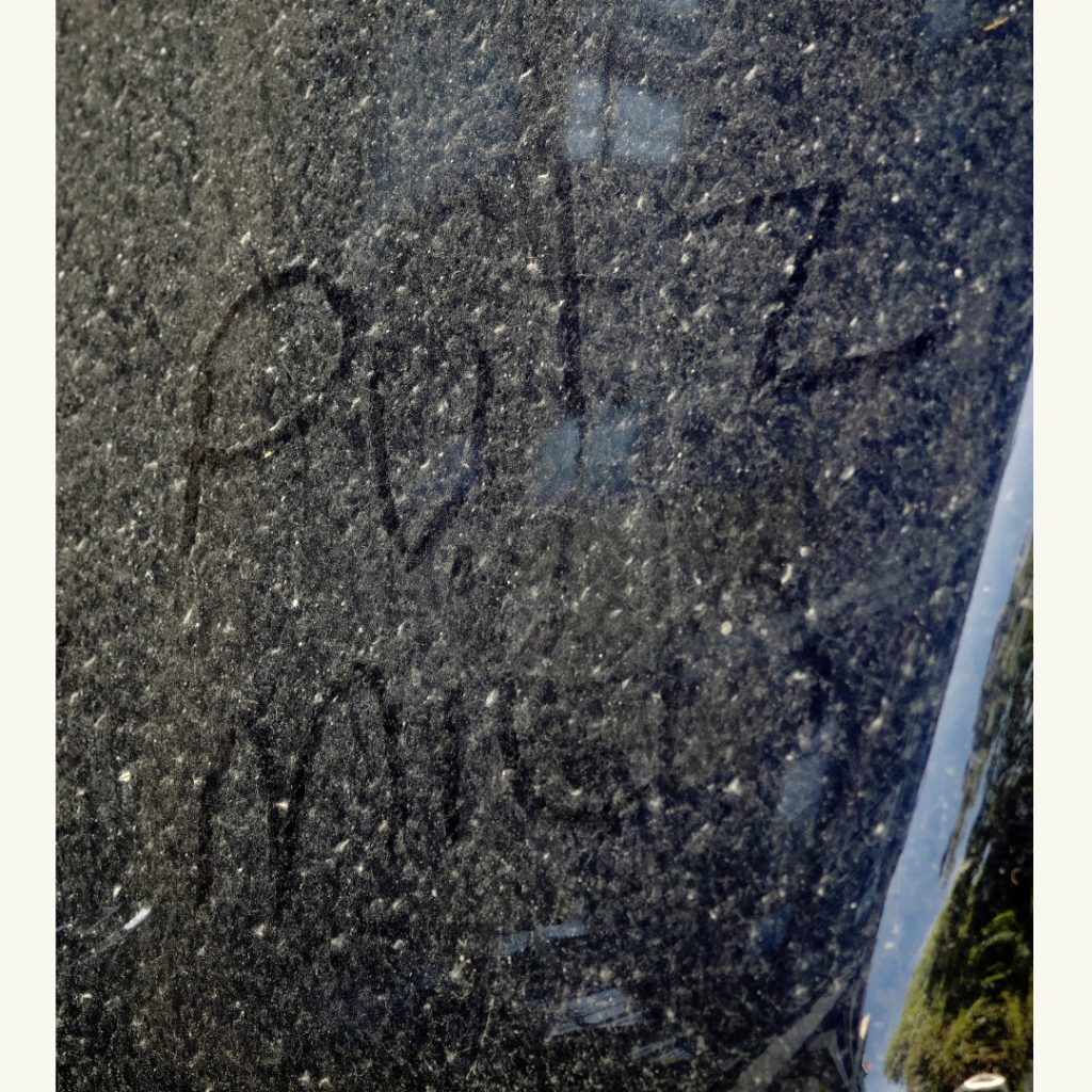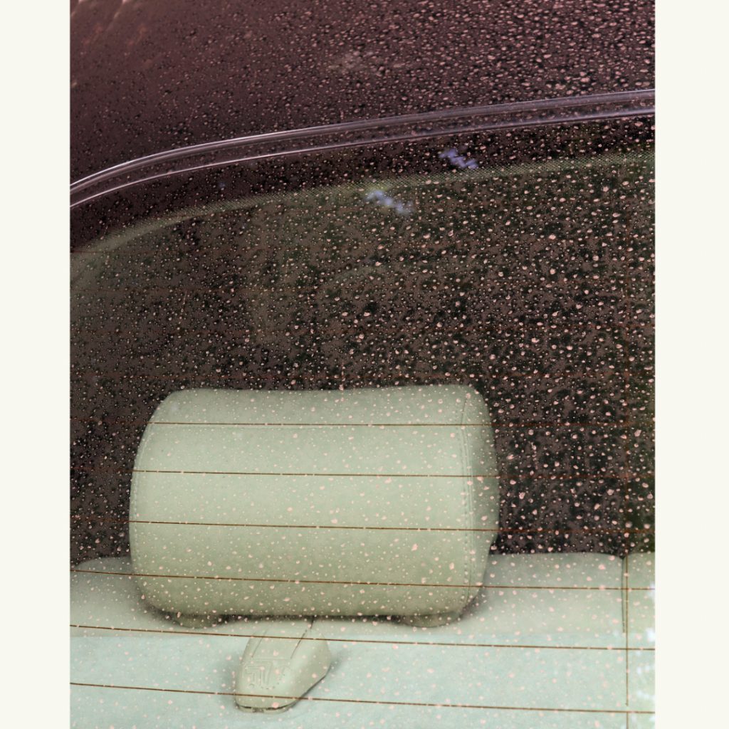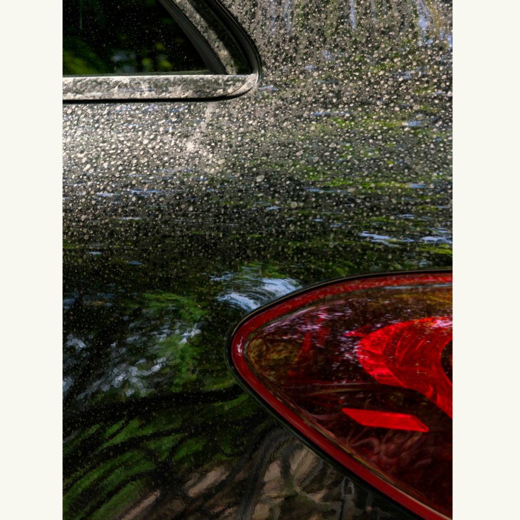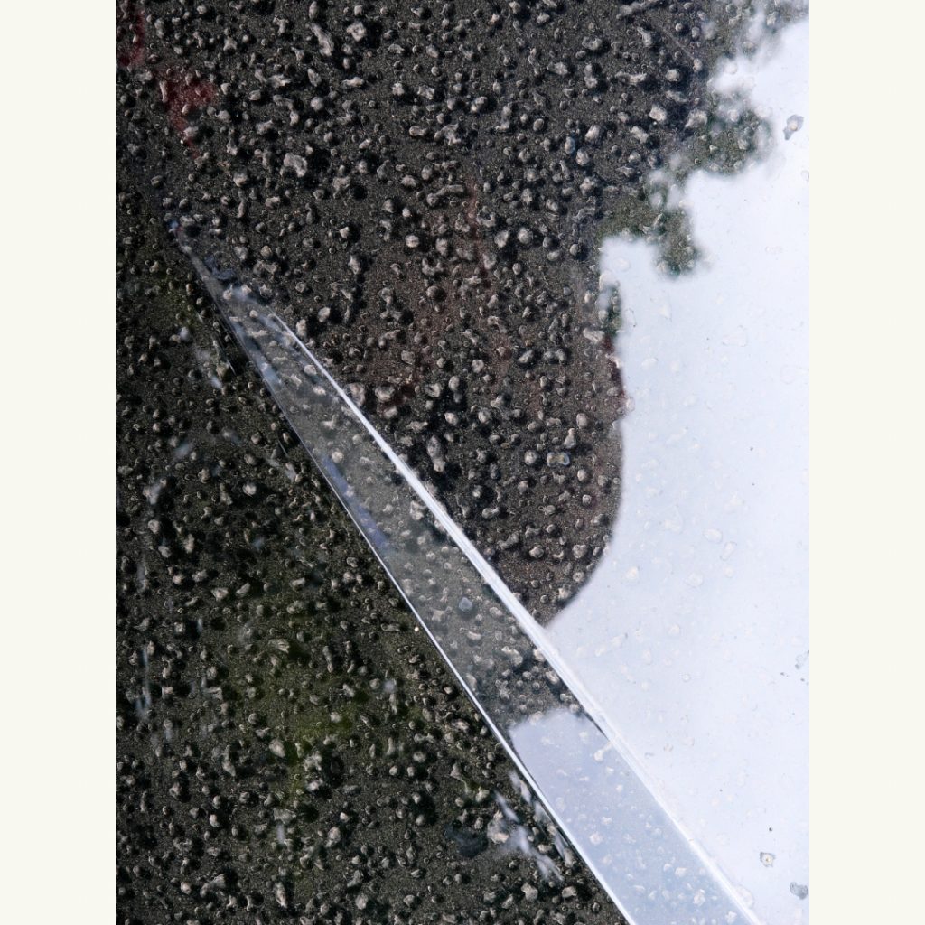 Die Sonne scheint nun hart durch den aufgerissenen Wolkenhimmel. Das Blau des Himmels, das Grün der Bäume spiegeln sich als willkommener Farbkontrast zum Ocker des Staubs. Im Close-up, im Anschnitt, durch die Reduktion verschwindet die Gegenständlichkeit der Objekte. Farben und Reflexionen geben nun den Flächen einen Rest von Form. Mit Fingern gemalte Statements kommen hinzu. Es gibt viel zu entdecken.