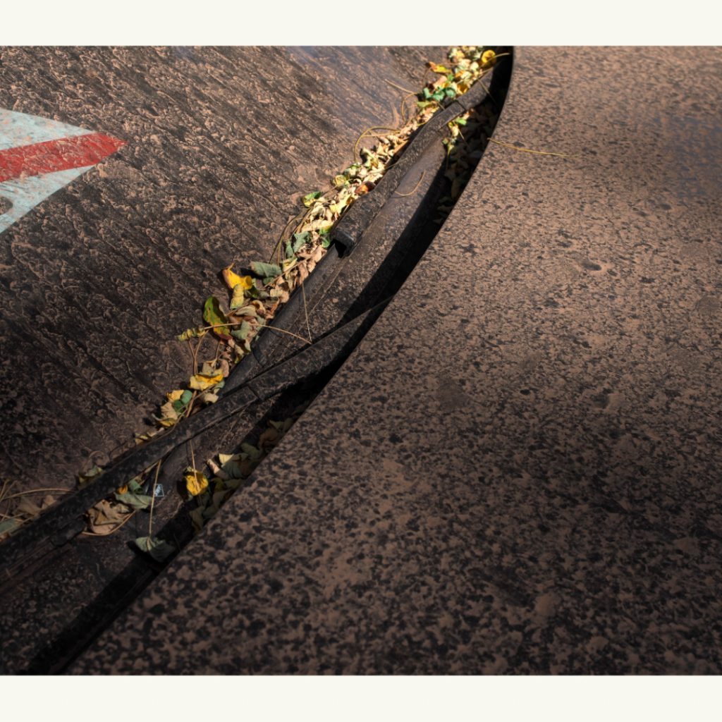 Später am Bildschirm beschneide ich viele Fotos noch weiter. Bin teilweise im Makrobereich. Suche die Nähe zur Lackoberfläche. Verstärke die Abstraktion. Manche Ansicht drehe ich, obwohl ich sie schon bei der Aufnahme auf dem Kopf einfing. Die Spurensuche zieht sich von der Aufnahme bis zur Bildbearbeitung durch.