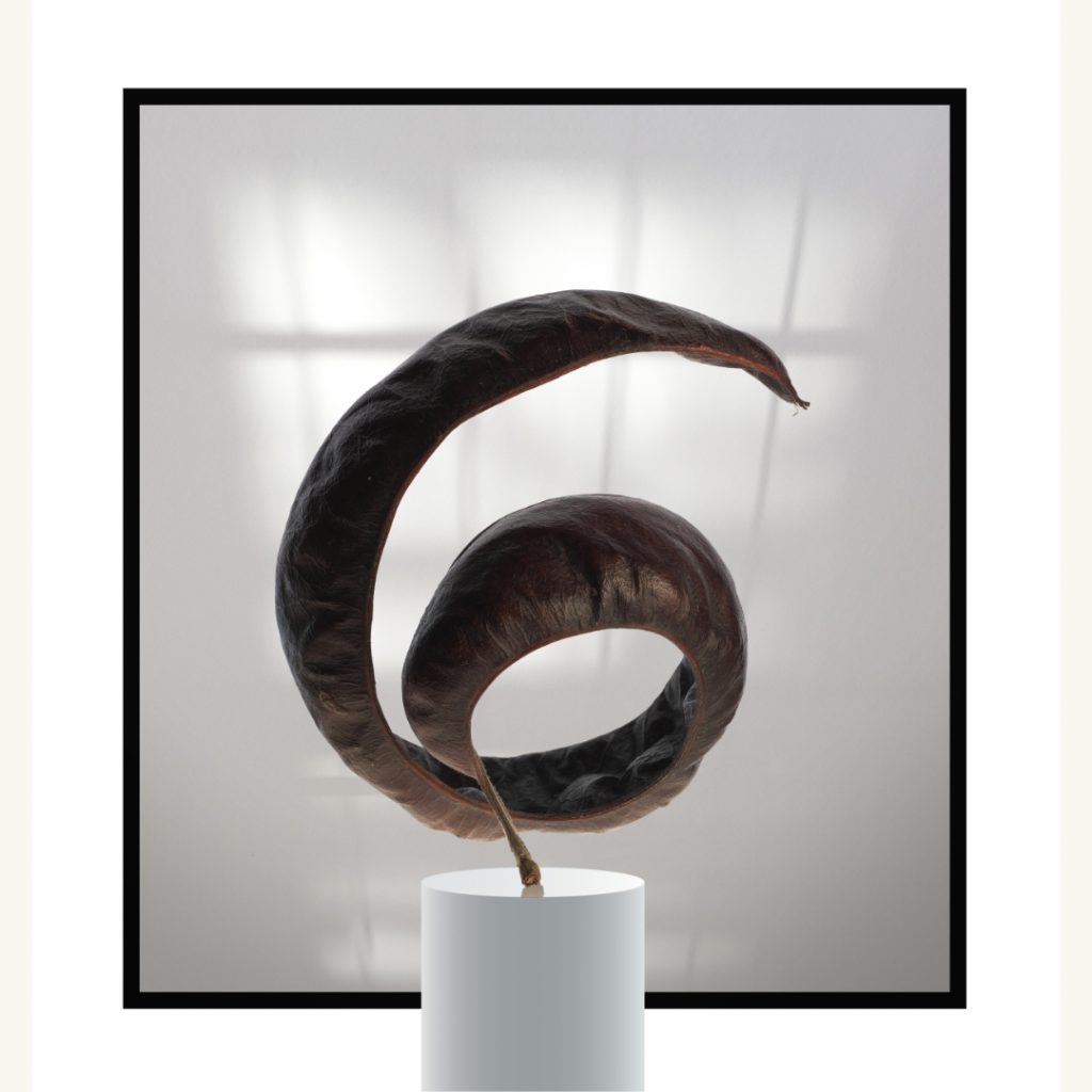 Lang gestreckt und dunkelbraun. Manche Kapseln allerdings winden sich spiralförmig und bekommen bei näherer Betrachtung etwas Skulpturales. Ein guter Grund für mich genauer hinzuschauen und diese kleinen Kunstwerke entsprechend zu präsentieren.